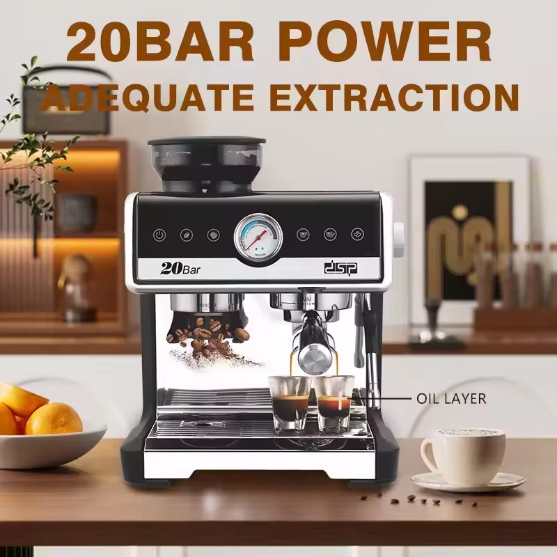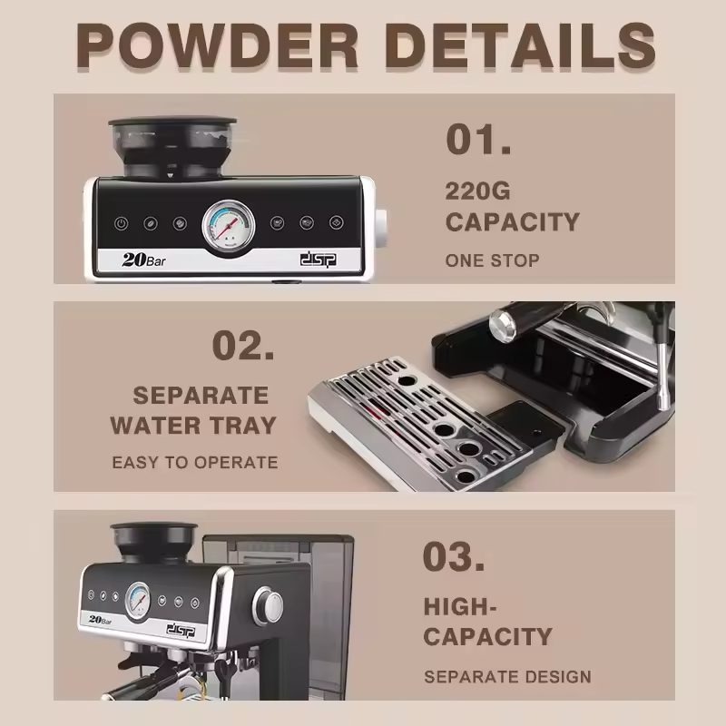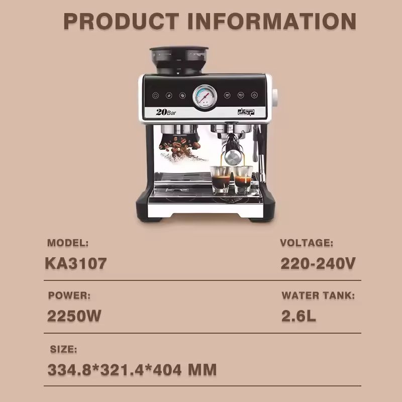 Introducing our Espresso Coffee Maker, a coffee lover’s dream. Boasts 20Bar power for adequate coffee extraction. Model KA3107, with voltage of 220 – 240V. Powered by 2250W for efficient brewing. Has a large 2.6L water tank for continuous use. Measures 334.8*321.4*404 MM, compact yet powerful. 220G capacity for one – stop coffee preparation. Features a separate water tray for easy operation. High – capacity design for multiple cups. Comes with a rotating steam pipe for latte art. Stylish black and silver design, fits any kitchen. Makes rich, flavorful espresso with ease.