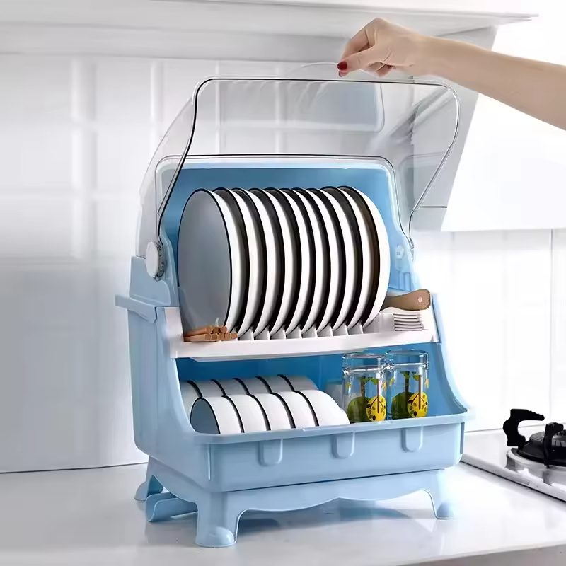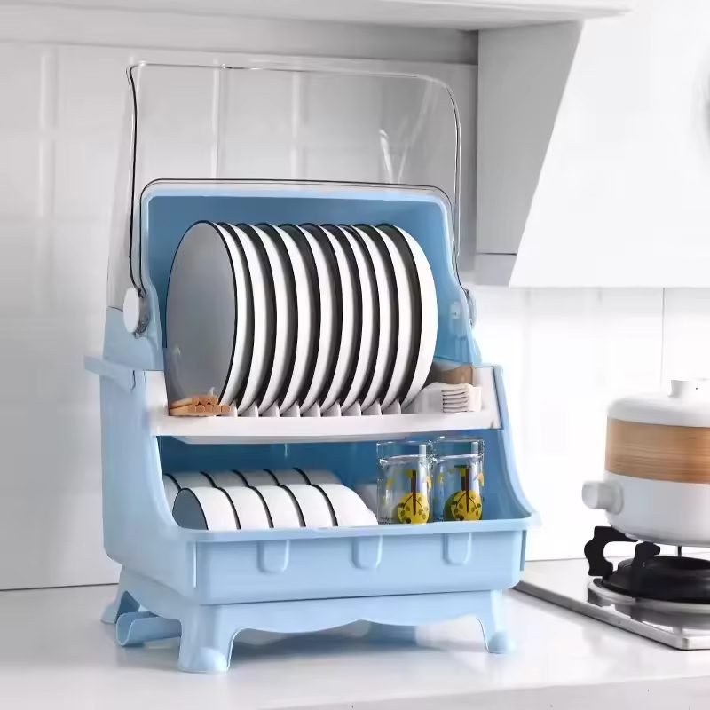 Introducing our Plastic Dish Drying Rack with Cover. Ideal for home, hotel, and restaurant use. Features a transparent cover for visibility and protection. Has multiple tiers to organize plates, bowls, and cups. Made of eco – friendly plastic, safe and durable. Customized logo is acceptable for personalization. Functions as a food container rack when needed. Efficiently drains water, keeping dishes dry. Compact design saves kitchen counter space. Easy to assemble and disassemble for cleaning. Stylish in colors like pink, blue, and white. A practical addition to your kitchen storage.